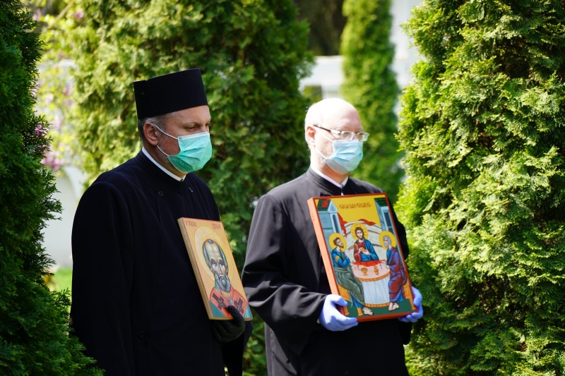În continuare, în parcul Centrului eparhial, chiriarhul Dunării de Jos a binecuvântat darurile pascale pregătite special de mănăstirile de maici și slujitorii sfintelor altare pentru această zi. Acestea au fost preluate de preoţii şi voluntariidesemnaţi, fiind oferite celor care în aceste zile de sărbătoare veghează şi se ostenesc pentru sănătatea și siguranța noastră, precum şi semenilor noştri aflaţi în carantină.