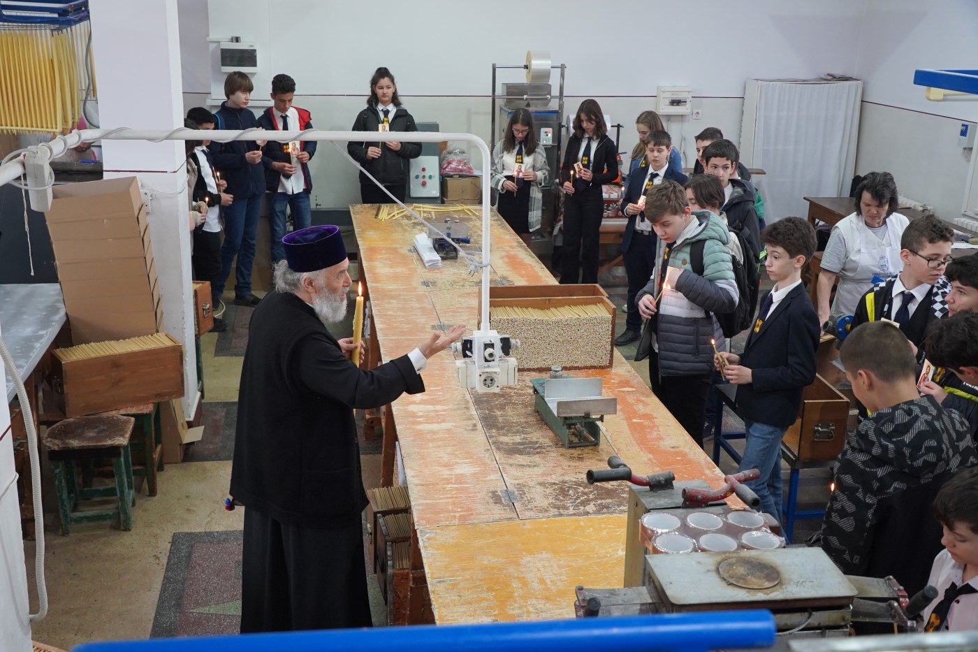 La Fabrica de lumânări, copiii au primit din partea Părintelui Arhiepiscop iconiţe şi lumânări şi le-au fost prezentate spaţiul de lucru, echipamentele de baza, tipurile de matriţe utilizate în activitatea de confecţionare a lumânărilor şi etapele procesului tehnologic de realizare al acestor obiecte de cult.
