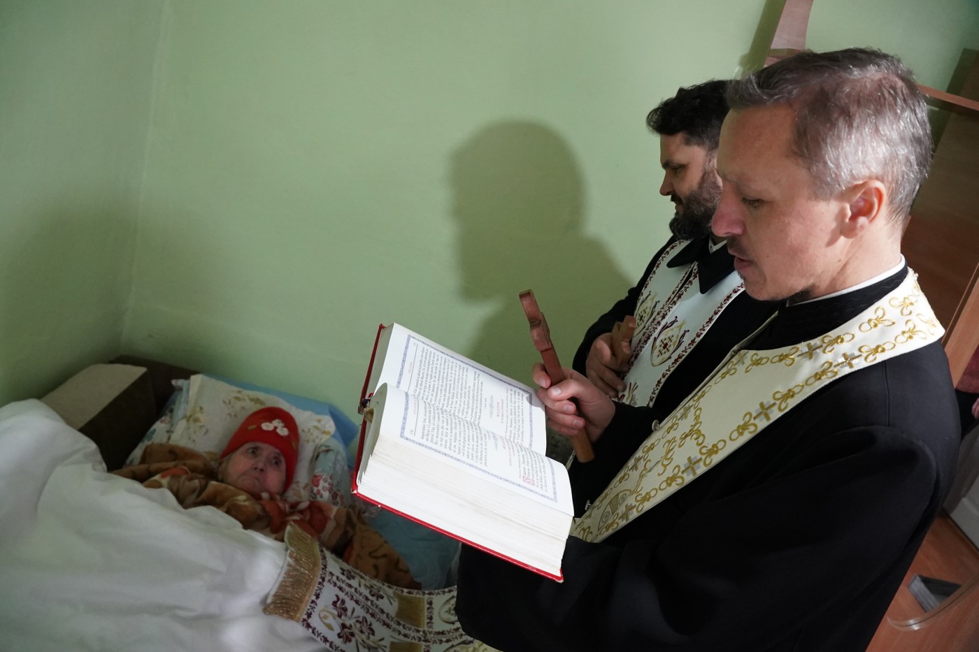 De la biserică, preoţii au mers la casele unor bătrâni bolnavi şi singuri pentru a le oferi pachete cu alimente de bază şi alte produse.