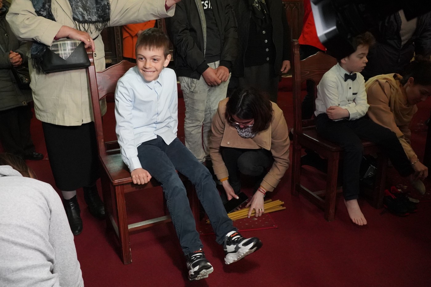La momentul liturgic cuvenit, urmând îndemnului Mântuitorului nostru Iisus Hristos, Înaltpreasfinţia Sa s-a încins cu ştergar şi a săvârşit ritualul respectiv celor 12 „mici ucenici“, după care le-a oferit făclii aprinse.