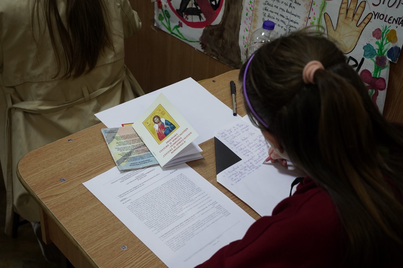 După momentele de înălţare duhovnicească din biserică, elevii au susţinut proba de examen la Şcoala Gimnazială „Mihu Dragomir“.