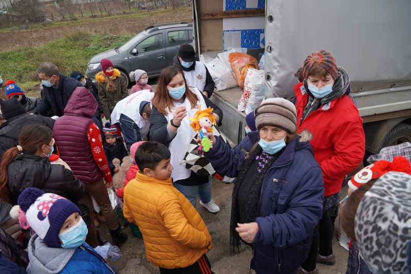 Prima acţiune de oferire a darurilor s-a desfăşurat astăzi în localitatea Nicoreşti din judeţul Galaţi şi a avut ca destinatari 50 de copii care provind din familii cu posibilităţi materiale reduse, aflaţi în evidenţele şcolii din localitate, 20 de persoane din cadrul unei instituţii de ocrotire socială, unele dintre acestea cu grave probleme de sănătate şi cu diferite grade de handicap, o familie cu 11 copii cu o situaţie materială precară şi o familie monoparentală cu 3 copii care locuieşte într-o casa modestă fără posibilităţi materiale.