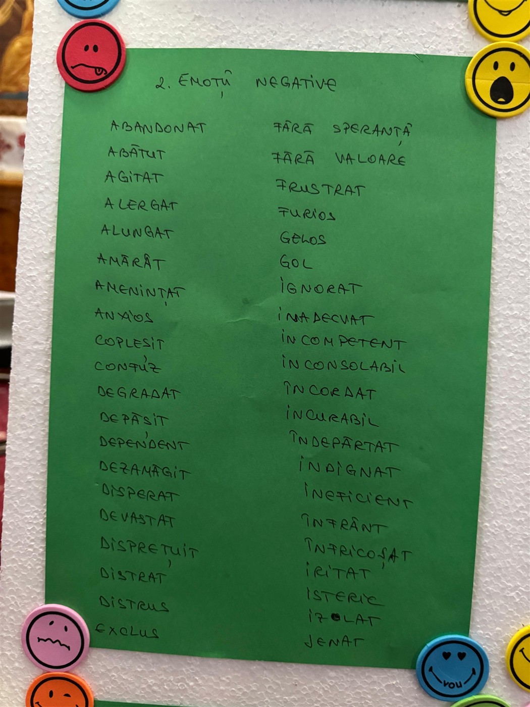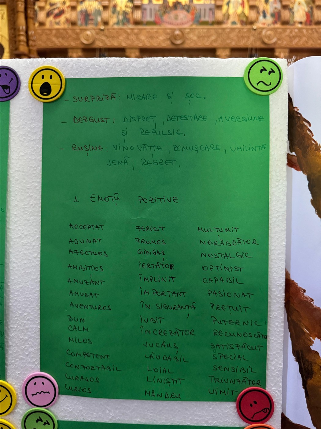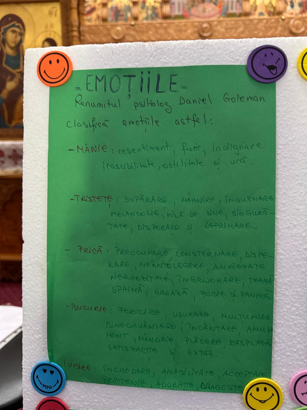 Au urmat activități creative, sub coordonarea doamnei preotese Geanina Vlad, activități prin care tinerii au aflat ce sunt emoțiile, la ce ajută și cum pot fi controlate. În același timp, elevii au alcătuit copacul emoțiilor unde fiecare a scris pe o frunză ce emoție a simțit în urma activităților desfășurate în biserică. Ulterior toate frunzele au fost lipite în copacul pictat de ei.