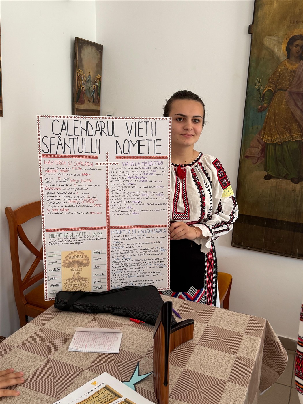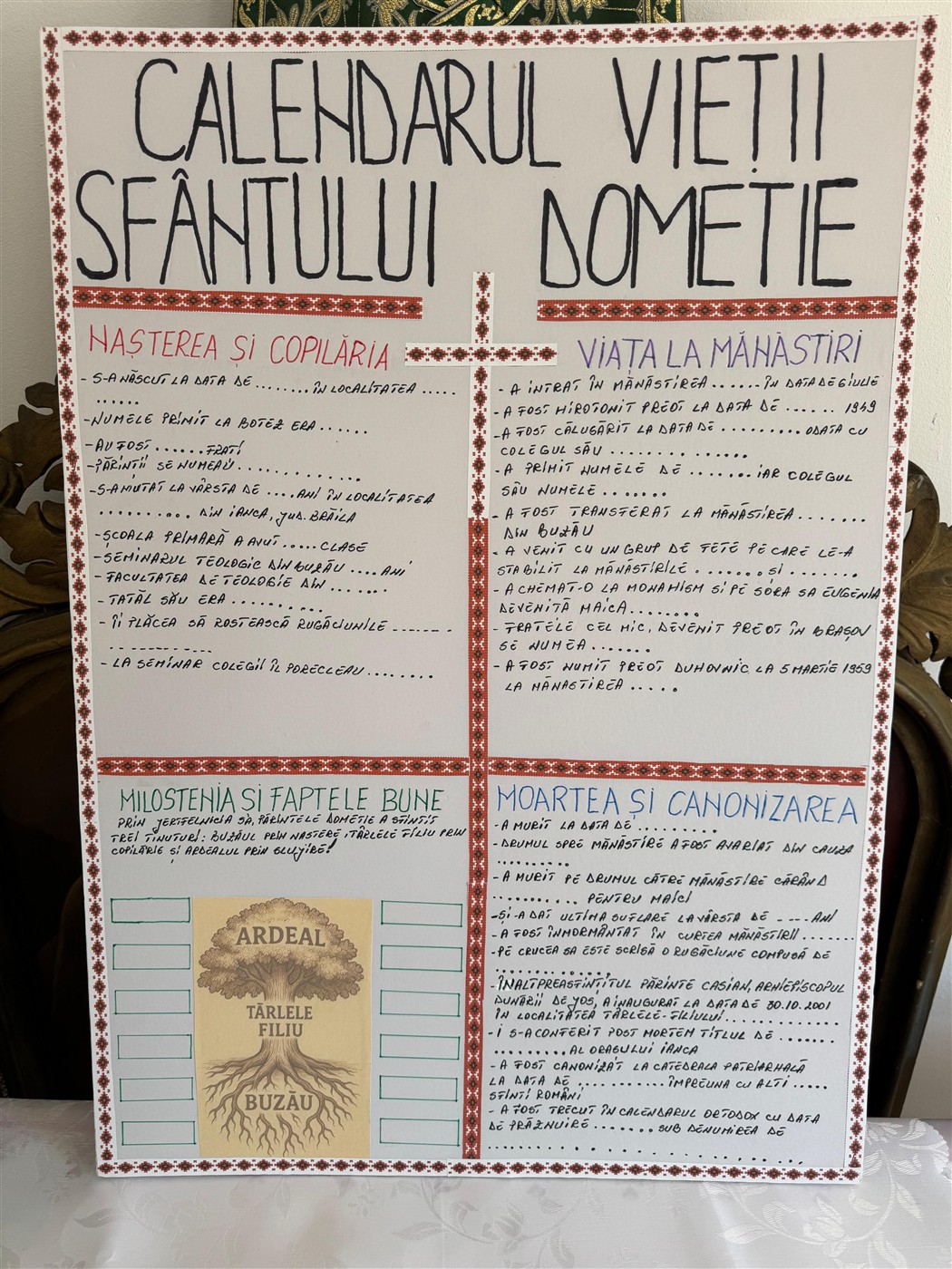 Calendarul vieții Sfântului Cuvios Dometie Manolache a fost tema centrală a activității catehetice. Prin truda doamnei preotese, Răileanu Ramona Andreea, elevii au ascultat, iar mai apoi au notat în caietele de cateheză aspecte din viața sfântului. Detalii precum: locul nașterii, locul copilăriei, numele părinților, locul studiilor, numele înainte de călugărie, numele după călugărie, mănăstirea în care a fost călugărit, dar și alte aspecte esențiale, au fost trecute pe pancarta alcătuită de aceștia numită ,,Calendarul vieții Sfântului Cuvios Dometie Manolache”.