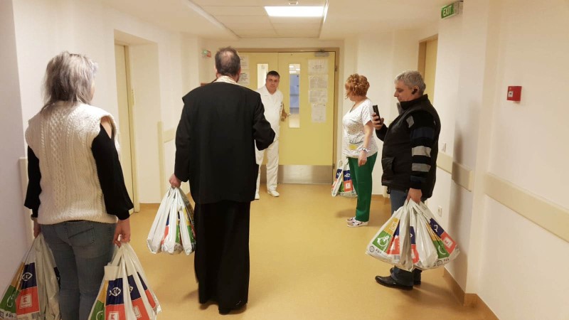 Activitatea de astăzi de la Maternitatea din Galați s-a încheiat cu binecuvântarea mamelor în saloane și oferirea de pachete cu alimente și diverse produse de îngrijire pentru copii.Toate persoanele internate în această Clinică gălăţeană au primit din partea parohiei și o masă caldă.