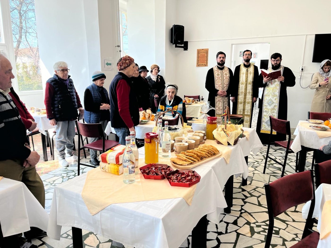 Ajunşi în mijlocul vârstnicilor, clericii de la Catedrala arhiepiscopală din Galaţi s-au rugat împreună cu asistaţii de aici şi i-au servit pe aceştia cu produsele pregătire pentru această zi specială de preotul nou hirotonit.