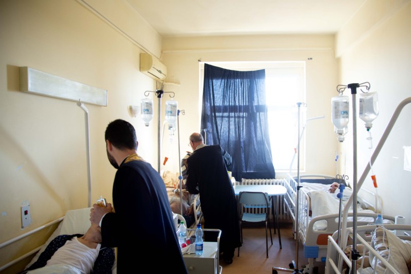 Aici, un sobor de preoţi slujitori în instituţiile sociale ale Bisericii a săvârşit Sfânta Liturghie în capela din curtea instituţiei medicale, după care, în holul mare al spitalului, a fost săvârşită Taina Sfântului Maslu.