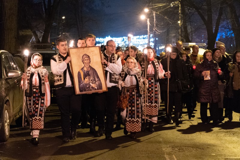 De la Catedrala Arhiepiscopală, tinerii entuziaşti cu icoana celui dintâi chemat dintre Apostoli, cu torţe şi lumânări aprinse în mâini au plecat către capela Seminarului Teologic Orotodox ocrotită de Sfântul Apostol Andrei, intonând pe tot parcursul procesiunii troparele Sfântului Apostol Andrei, ale Sfântului Ierarh Grigorie Dascălul şi alte cântări bisericeşti.
