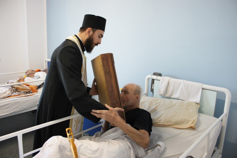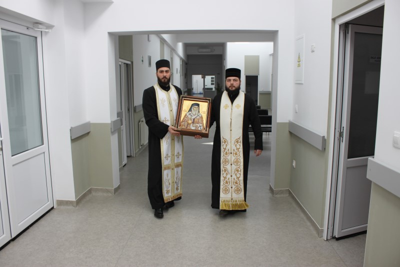 Preoţii, purtând pe braţe icoana cu sfintele moaşte, au vizitat bolnavii din spital, în saloanele şi la paturile lor, aducându-le alinare în suferinţă şi oferindu-le câte o iconiţă cu chipul Sfântului Ierarh Nectarie Taumaturgul.